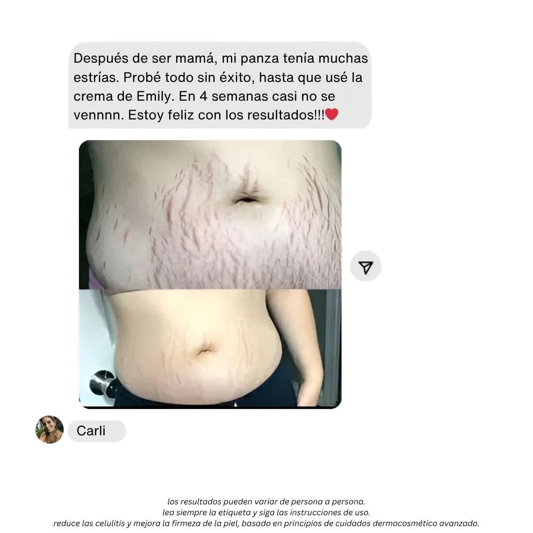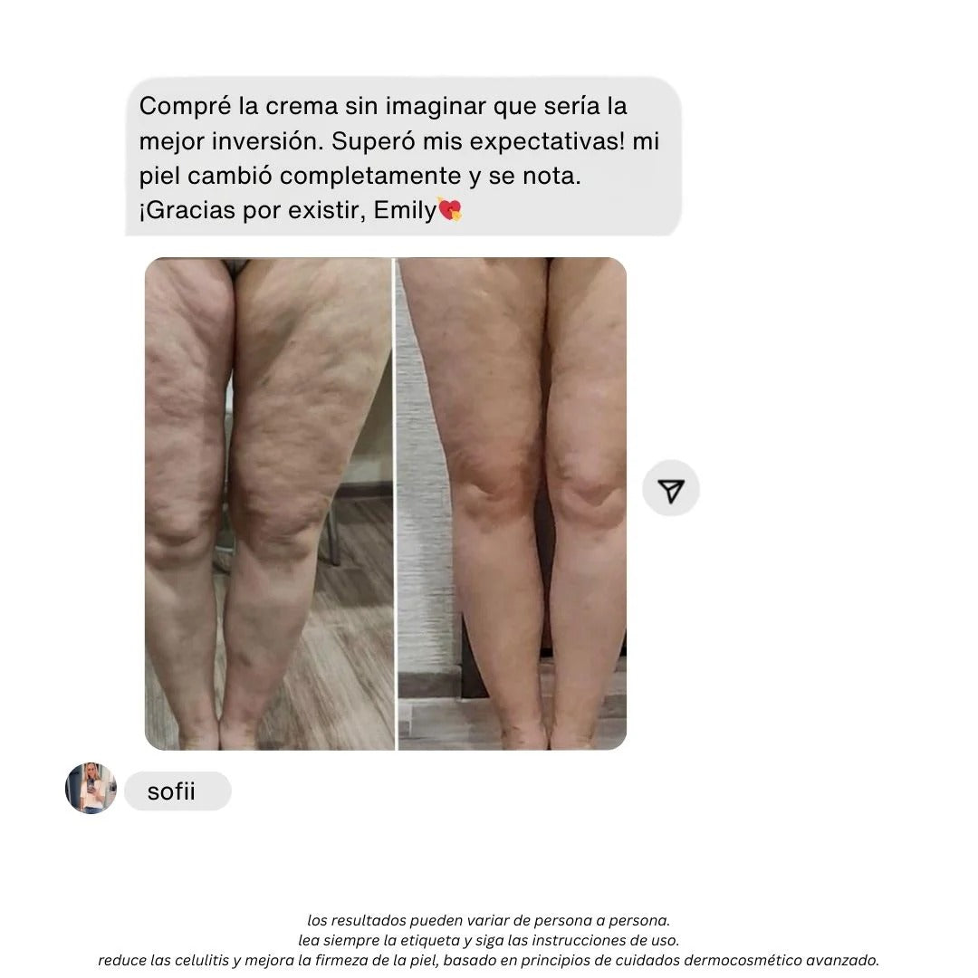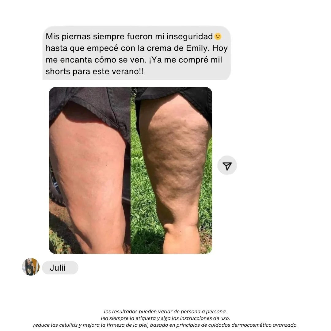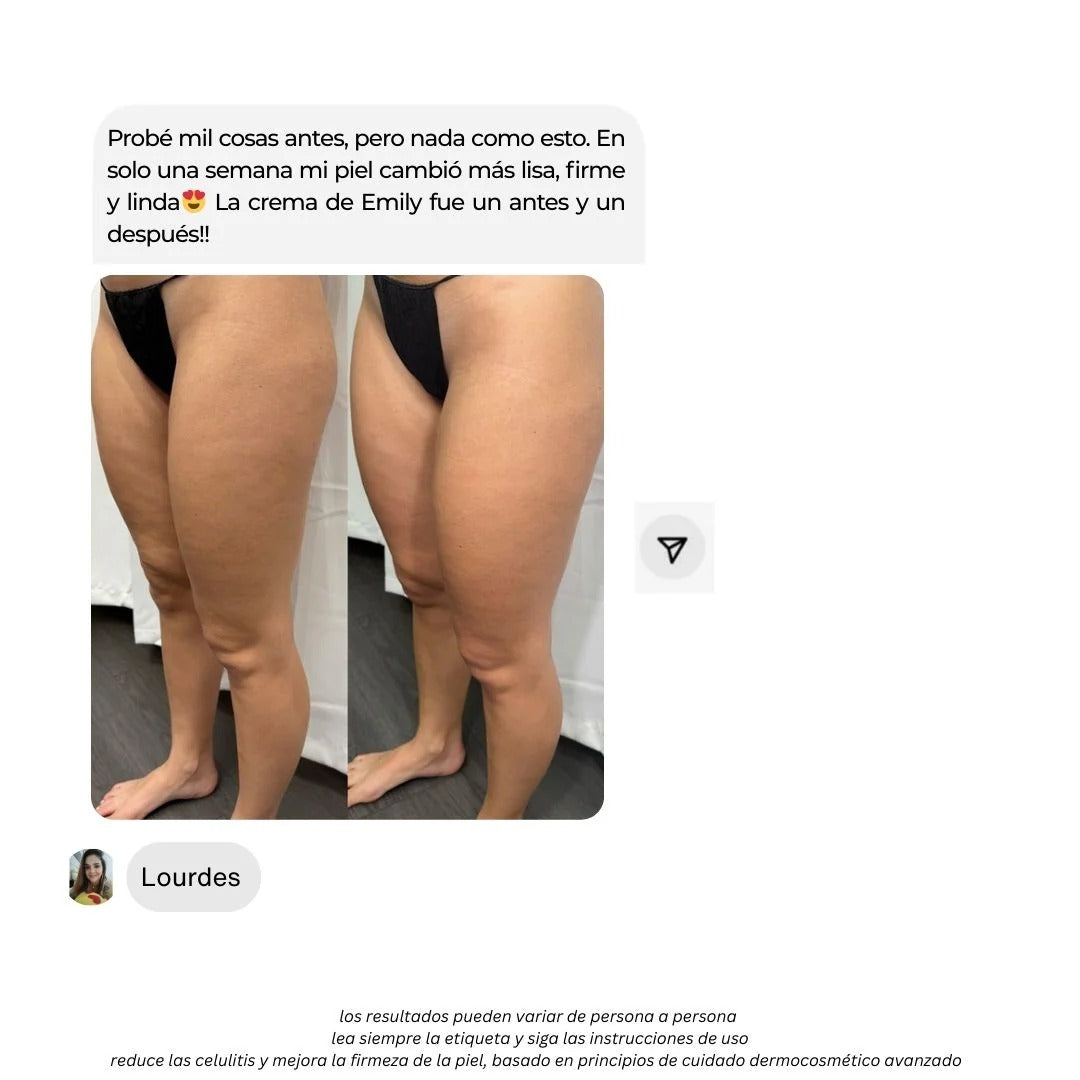 Por eso creamos la Crema Anticelulitis Emily, una fórmula avanzada con centella asiática, vitamina E y alcanfor natural que activa la circulación, reafirma y devuelve la elasticidad perdida.