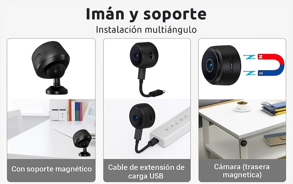 Con su base magnética y su amplio ángulo de visión de 180°, puedes colocarla fácilmente en cualquier lugar.