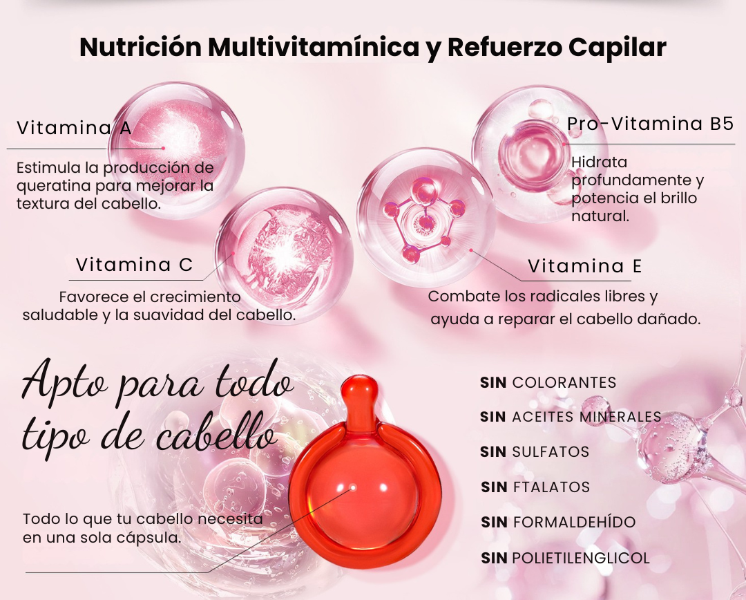 Nutre, repara y da brillo a tu cabello en segundos. Estas cápsulas están diseñadas para brindarte un tratamiento profesional sin esfuerzo, desde la comodidad de tu casa.