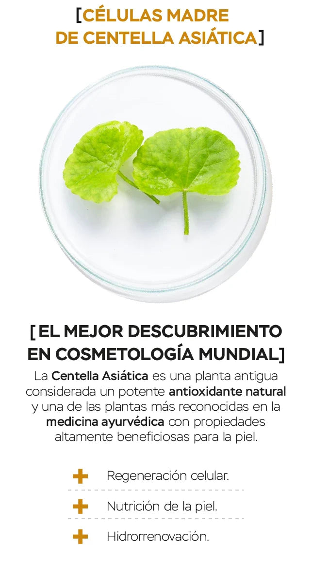 La Centella Asiática es una planta milenaria considerada como un potente antioxidante natural. Sus células madre ayudan a mejorar la elasticidad, firmeza e hidratación de la piel.